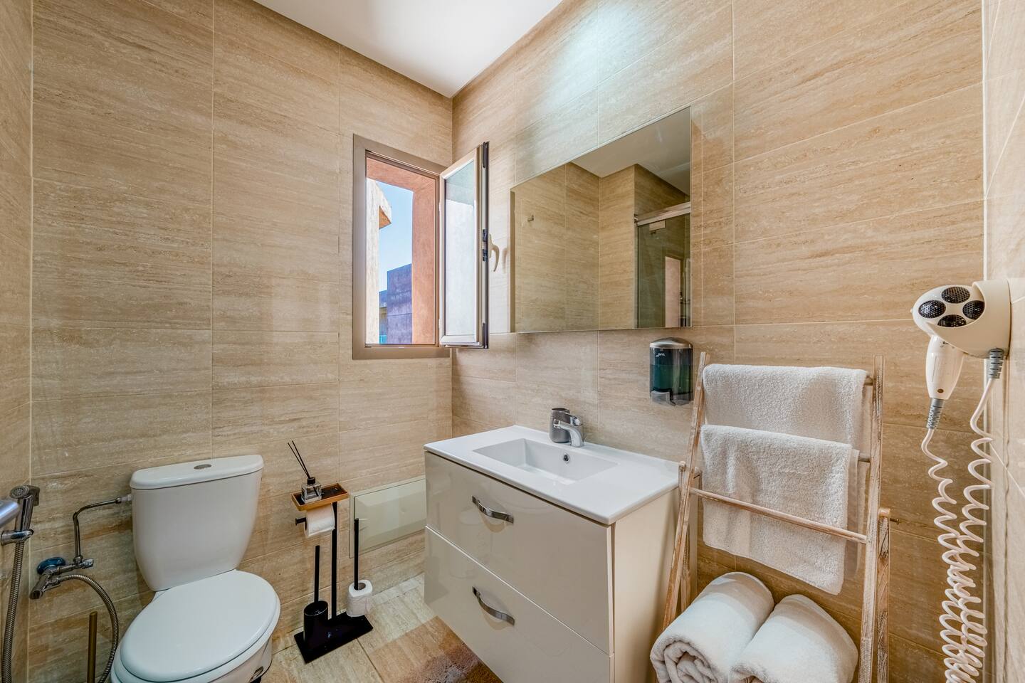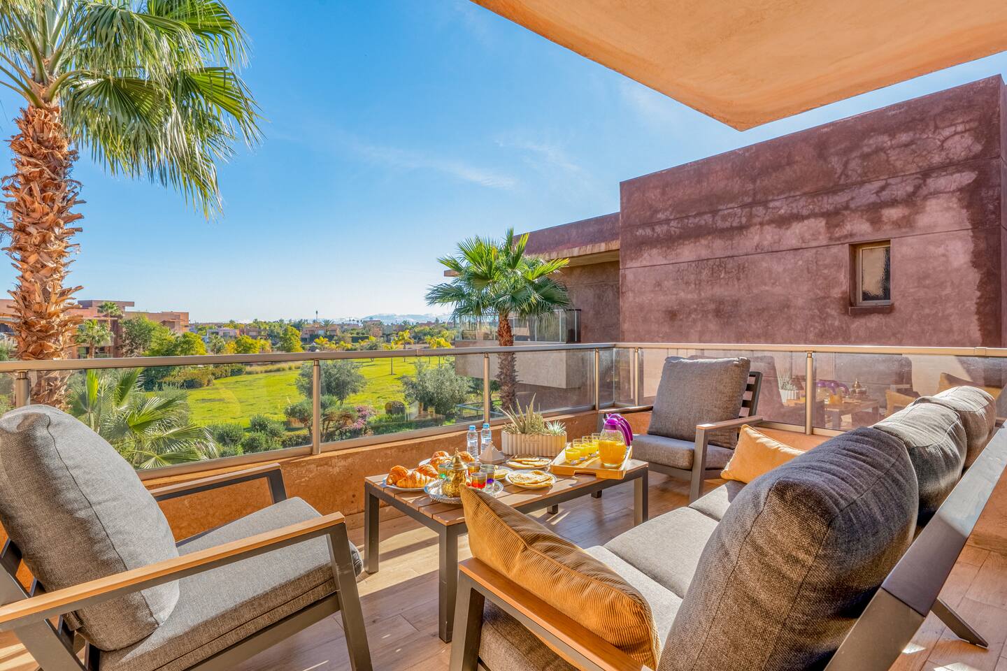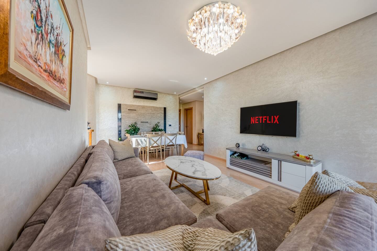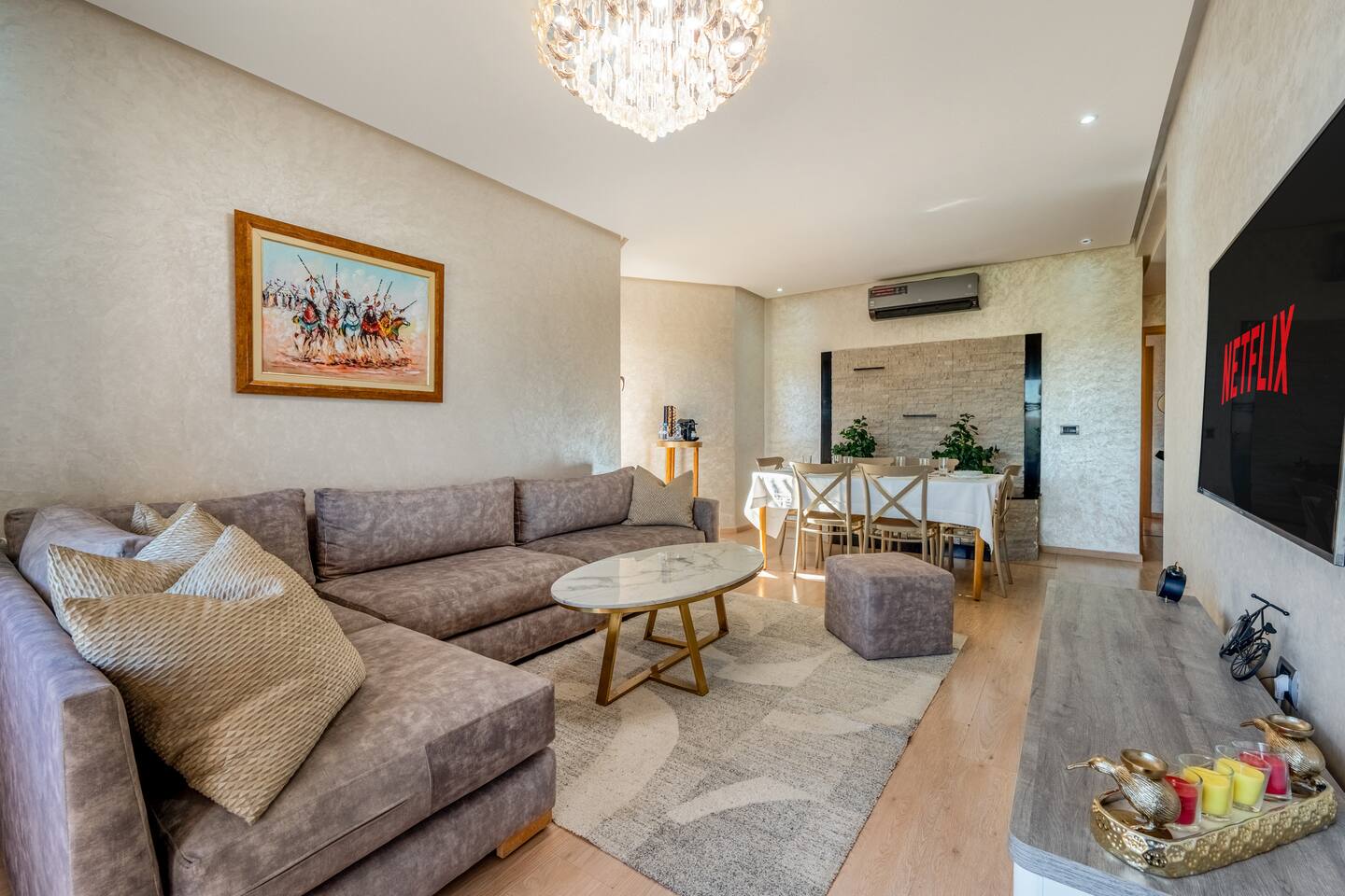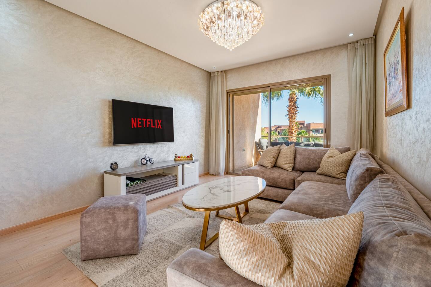 5-room apartment consisting of a living room, 3 bedrooms, 2 bathrooms and 1 kitchen. You will have the pleasure of spending your holidays with all the comfort in an apartment of 95 square meters with a MAGNIFICENT sunny terrace with a direct view of the GOLF. Rooms: - Sheets - Extra pillows and blankets - Iron and ironing board - Hangers Bathroom: - Bath towels - Hand towels - Toilet paper - Hand soap - Shower gel Exterior: Large and magnificent terrace furnished with style The residence offers sumptuous green spaces on the edge of the GOLF as well as a sumptuous SWIMMING POOL accessible to all. It is the ideal place to relax and RELAX. Kitchen: - Basic kitchen utensils (pots, pans, dishes and cutlery) - Work plan - Oven - Refrigerator - Cooking plate - NESPRESSO coffee maker - Moroccan teapot - Tajine - Kettle Equipment: - Very high speed WIFI (Fiber) - Air conditioner - Heating - Iron - Hair dryer - Smart TV with NETFLIX in every room - Dishwasher - Washing machine 8 kg Installation: Free parking in front of the residence Close to all amenities (grocery store, market, shopping street, pharmacy, Carrefour hypermarket...), the accommodation is 5 minutes from the airport, 10 minutes from Guéliz and the medina. Located in one of Marrakech's most sought-after neighborhoods, the Prestigia estate offers an exclusive living environment that blends luxury, tranquility, and lush greenery. Nestled in the heart of this prestigious resort, the Opale residence captivates with its peaceful, secure, and elegant atmosphere, ideal for a stay as a couple, with family, or with friends. Surrounded by magnificent landscaped gardens and bordering a renowned golf course, the area invites relaxation and a change of scenery. Residents enjoy top-of-the-range amenities: swimming pools, meticulously maintained green spaces, a golf course, and access to a clubhouse with restaurants and terraces. Despite its quiet, residential ambiance, Prestigia boasts a strategic location. You are just minutes from the city center, Avenue Mohammed VI, Marrakech Menara Airport, and major attractions such as the medina, the Menara Gardens, and trendy shopping centers and restaurants. The area is particularly appreciated for its 24/7 security, family-friendly environment and high standard, offering a perfect balance between serenity and urban proximity.